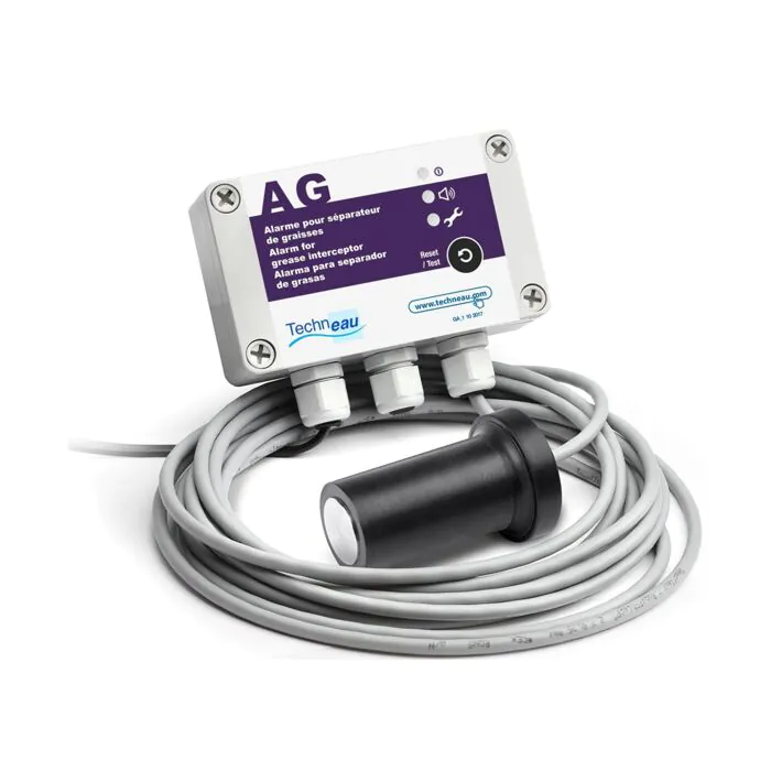 Inclut un boîtier de contrôle IP65, une sonde capacitive installée dans le séparateur, une connexion de câble, une cosse-coeur, et 5m de câble. La sonde capacitive, plus sensible que les systèmes résistifs, mesure la couche de graisses et déclenche une alarme quand elle est complètement submergée.